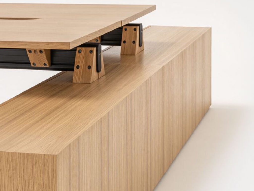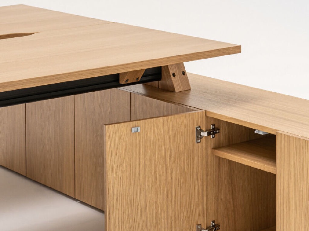 Gama de birouri operaționale Viga este realizată din materiale premium - stejar, fenix negru laminat - anti-amprentă, iar grinda este din aluminiu extrudat.