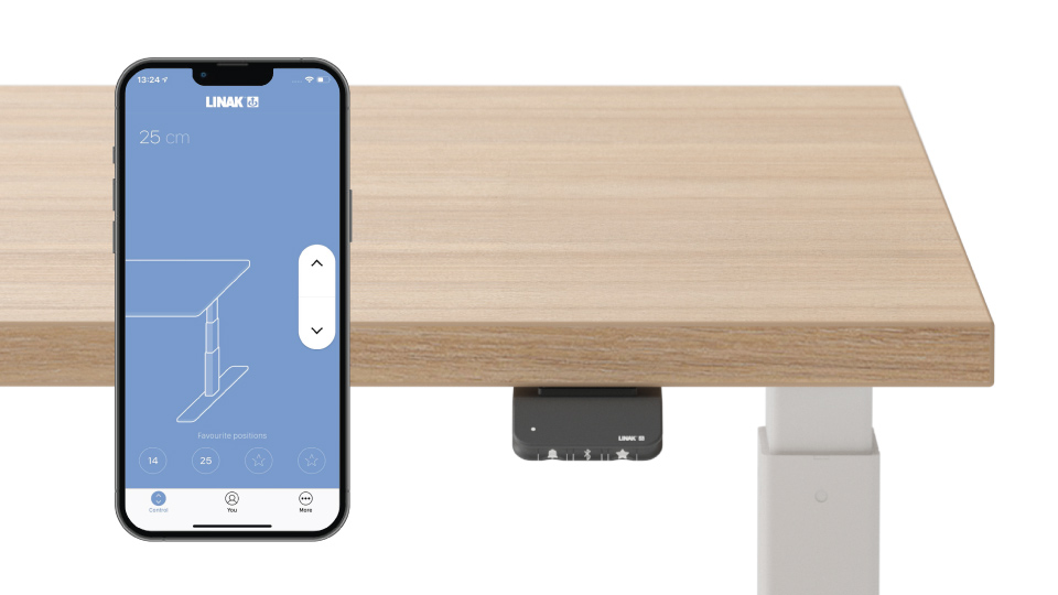 Ajustare ușoară: Puteți regla înălțimea biroului printr-o apăsare de buton sau prin intermediul telecomenzii Bluetooth de pe smartphone. Alegeți o înălțime personalizată pentru cea mai confortabilă poziție de lucru și salvați preferințele de înălțime. Folosind aplicația LINAK, puteți primi, de asemenea, un memento pentru a alterna pozițiile stând și în picioare.