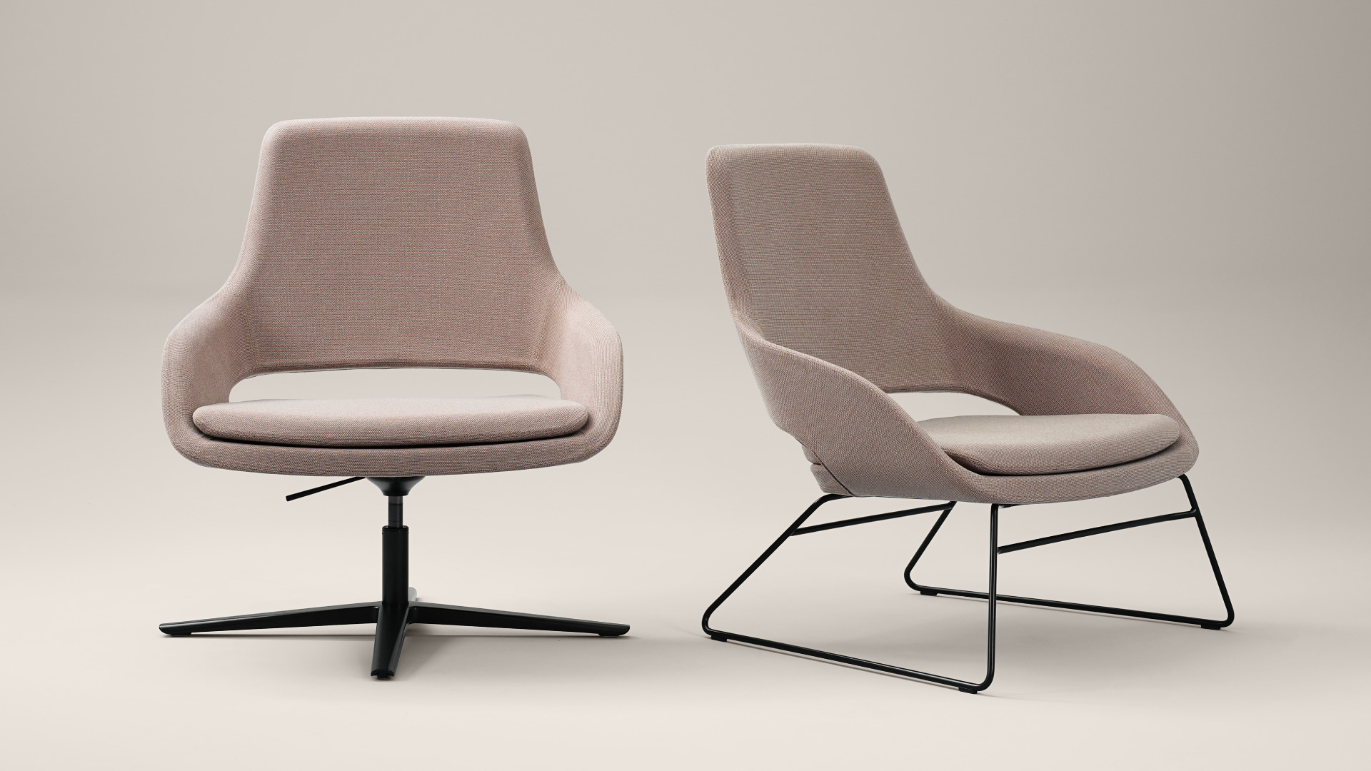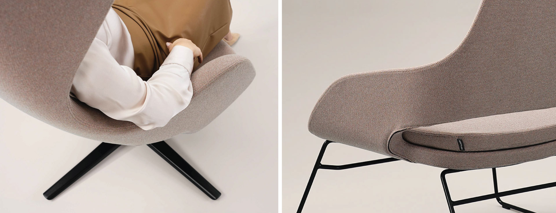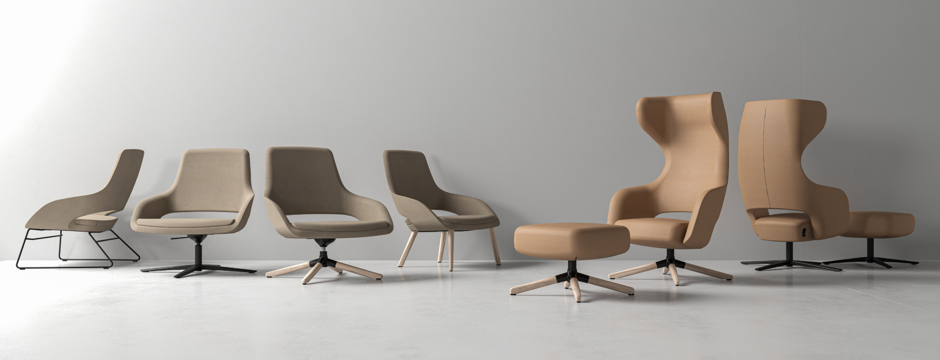 Fotoliile SANDIE, cu spătar înalt sau jos, pot fi personalizate cu diverse tipuri de baze pentru a se potrivi perfect oricărui interior: