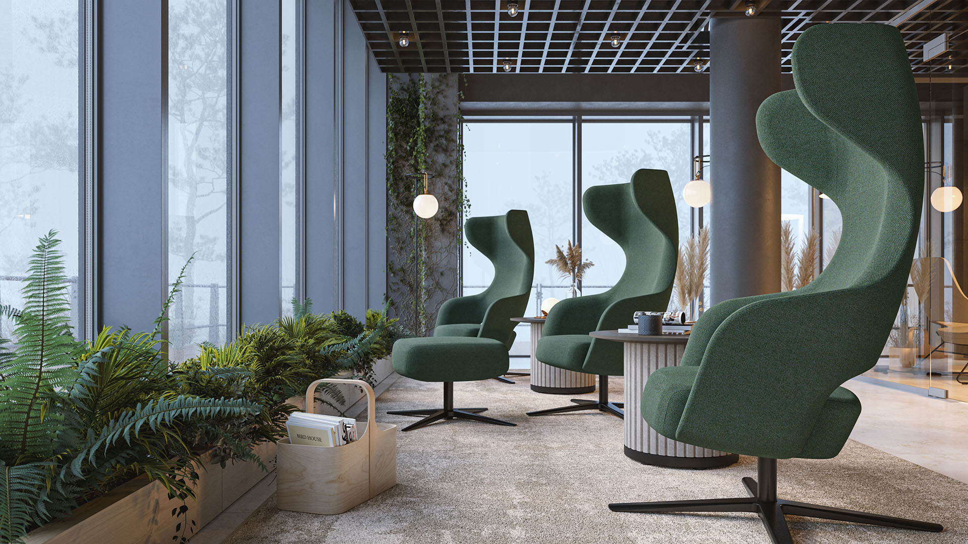 Piesele moi și confortabile sunt tot mai des folosite în zonele de relaxare ale birourilor, oferind angajaților un loc unde se pot destinde în timpul zilei. Spătarul înalt, plăcut și învăluitor, asigură intimitate și izolează de zgomotul din jur.