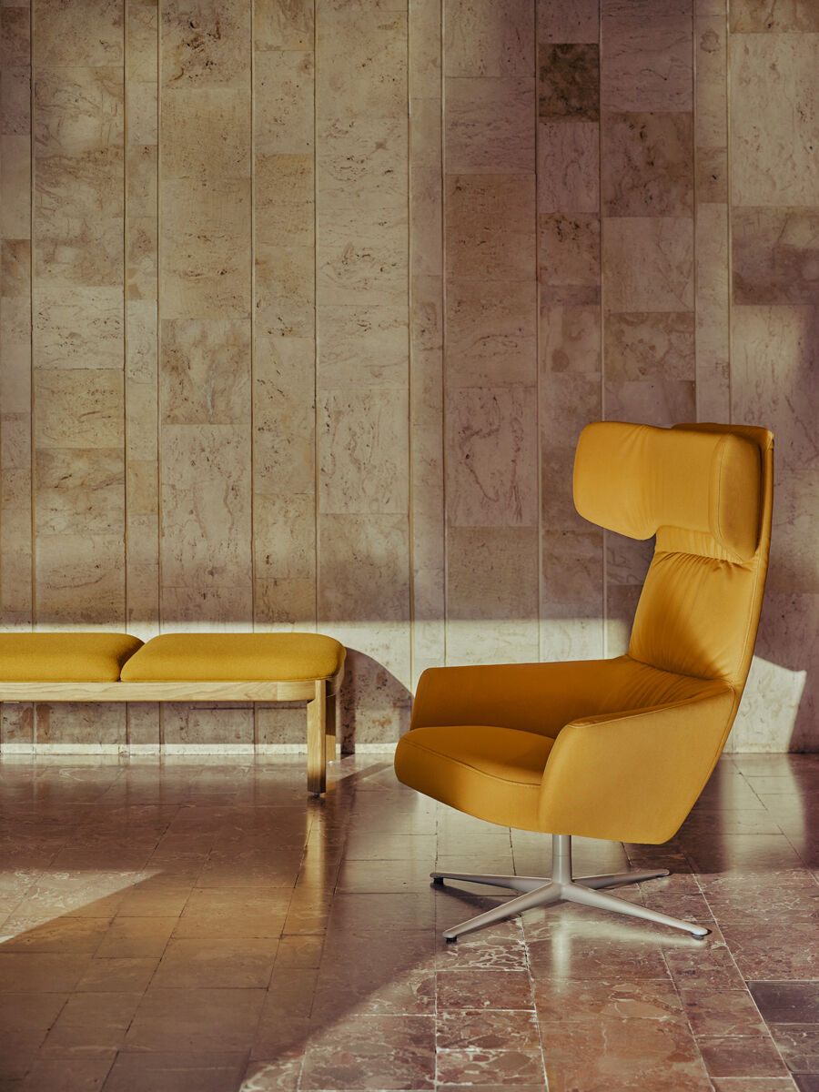 Spătar: spumă turnată, ignifugă, densitate 65 kg/m³, tapițat; disponibil în două înălțimi; opțional cu tetiere și panouri laterale pentru crearea unei zone semi-private