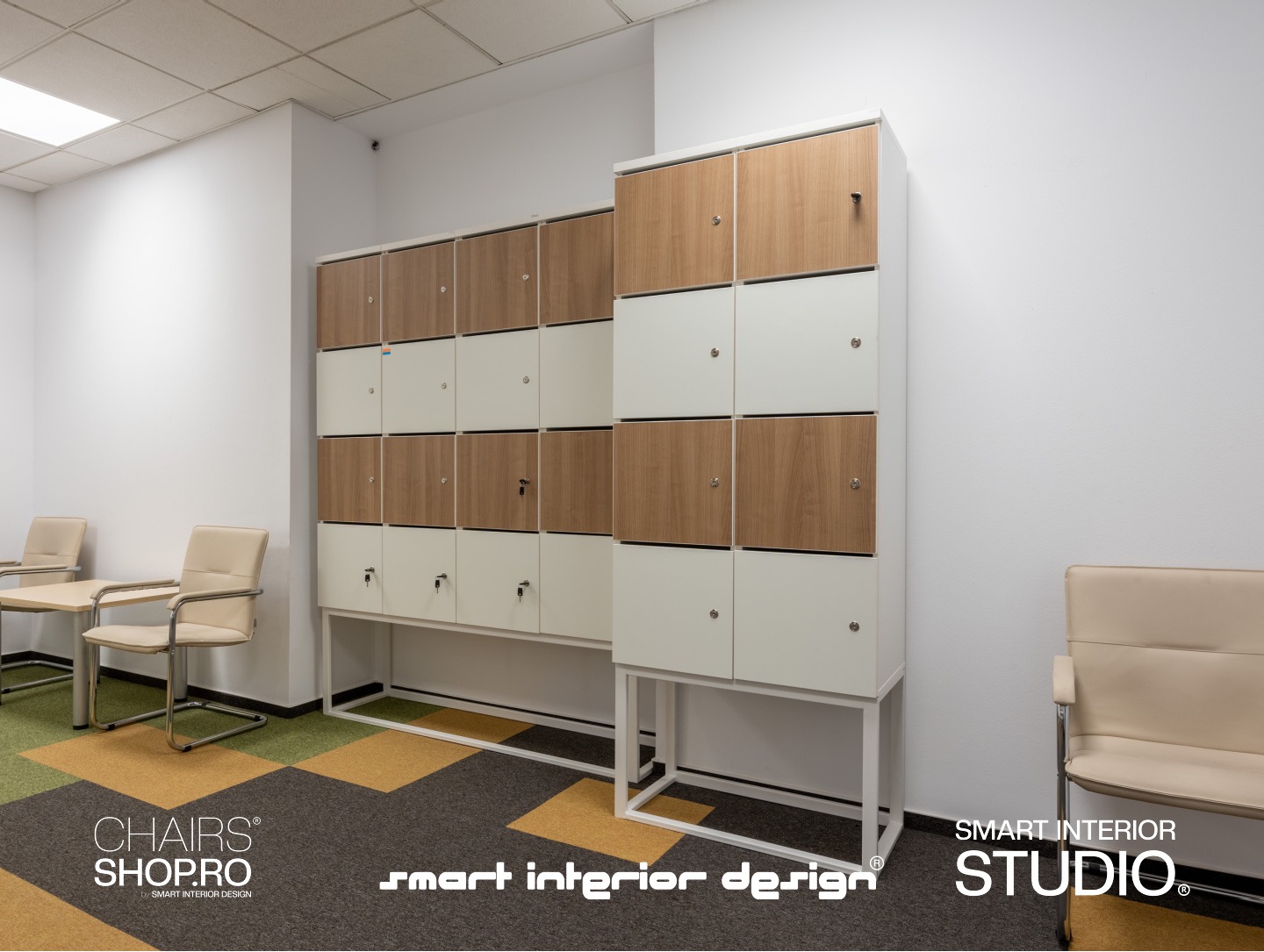 Amenajare birou echipă, dulapuri depozitare Locker, zone de discuții colective și delimitare zone cu panouri.