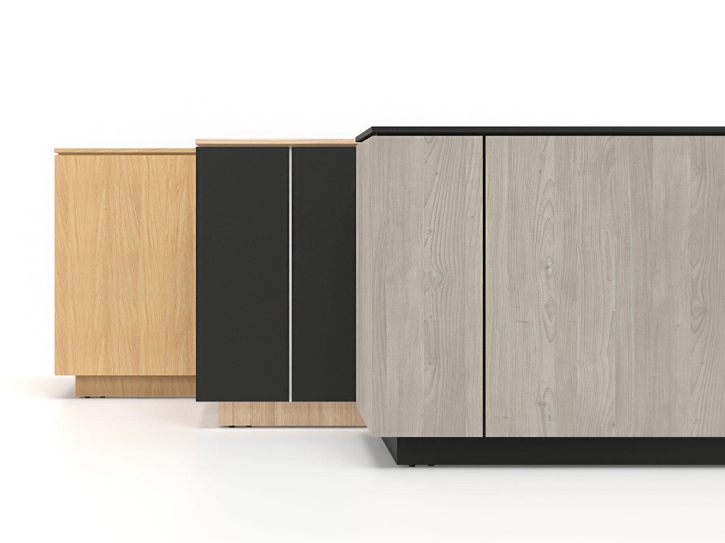 Combinări subtile de finisaje: În funcție de stilul dorit pentru interior, aveți opțiunea de a alege între front melaminat confortabil sau un finisaj de furnir luxos. De asemenea, există multiple opțiuni pentru combinarea culorile frontului și al blatului superior. Utilizând același finisaj pe întreaga unitate (top, front și bază), veți obține un aspect solid și minimalist, caracterizat prin linii clare și netede. În schimb, dacă optați pentru un blat de culoare diferită sau inserții decorative, veți adăuga o notă subtilă de eleganță acestui design.