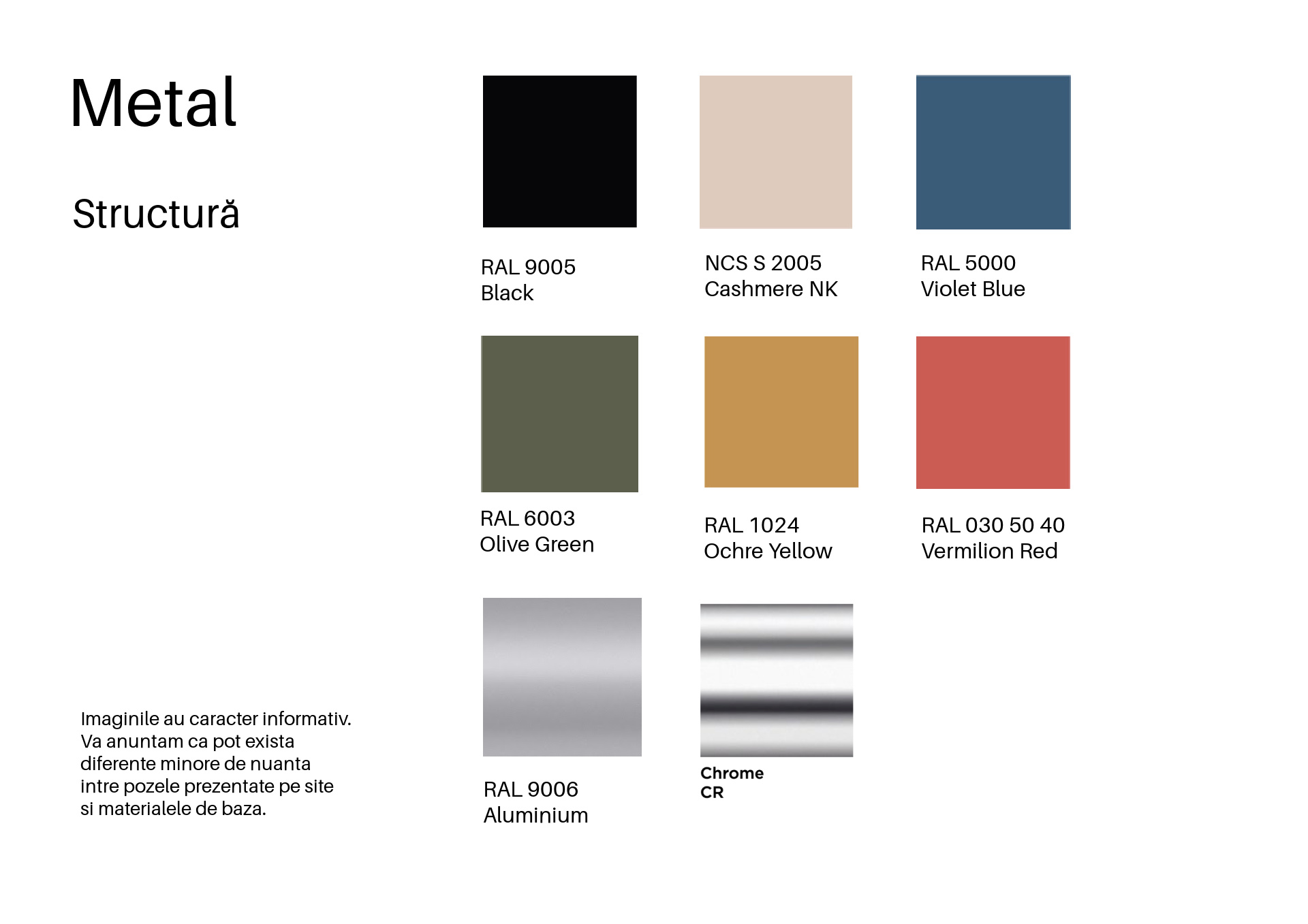 Structură metalică: Disponibilă în finisaje negre sau aluminate.