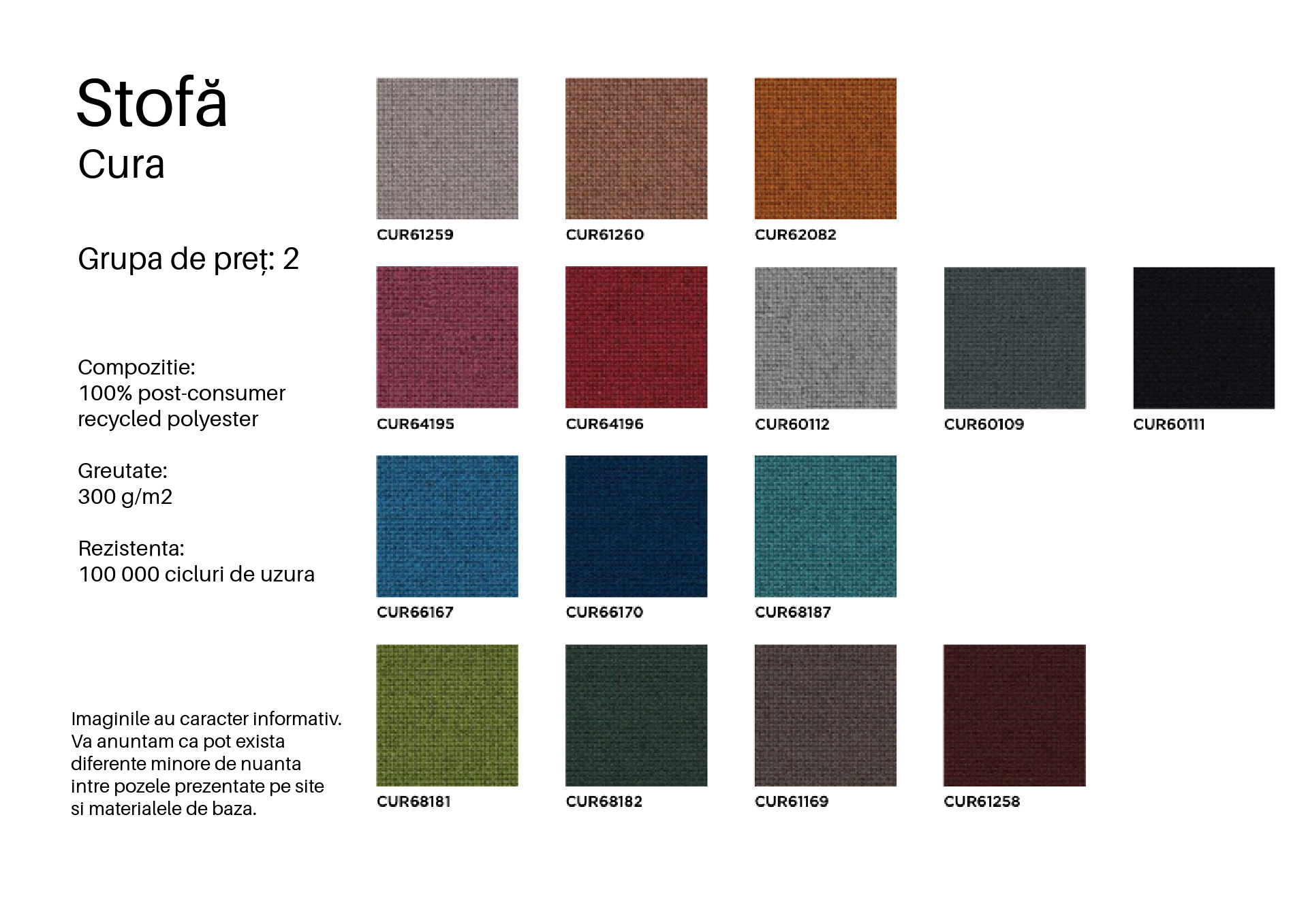 Un element distinctiv al gamei este posibilitatea de a combina două culori diferite din același material de tapițerie, oferind flexibilitate în personalizarea spațiului. Gama variată de materiale și finisaje permite integrarea perfectă în orice concept de amenajare.