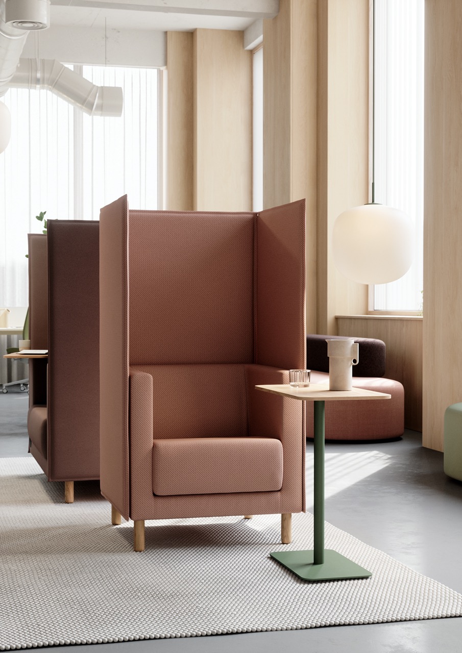 O soluție elegantă pentru birouri și coworking-uri, fotoliul oferă confort, intimitate și separare acustică prin designul său cu pereți înalți tapițați.