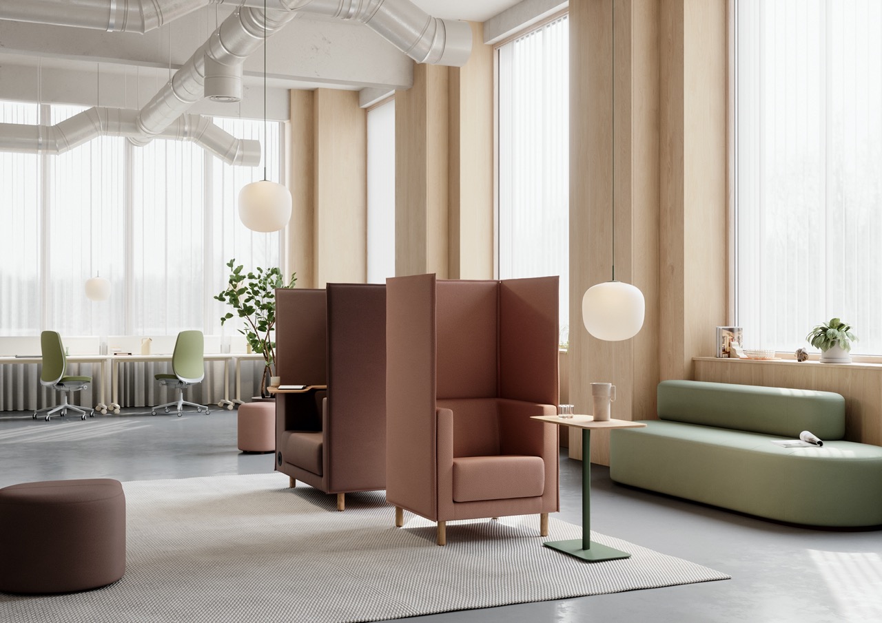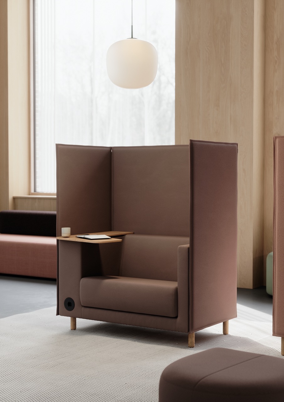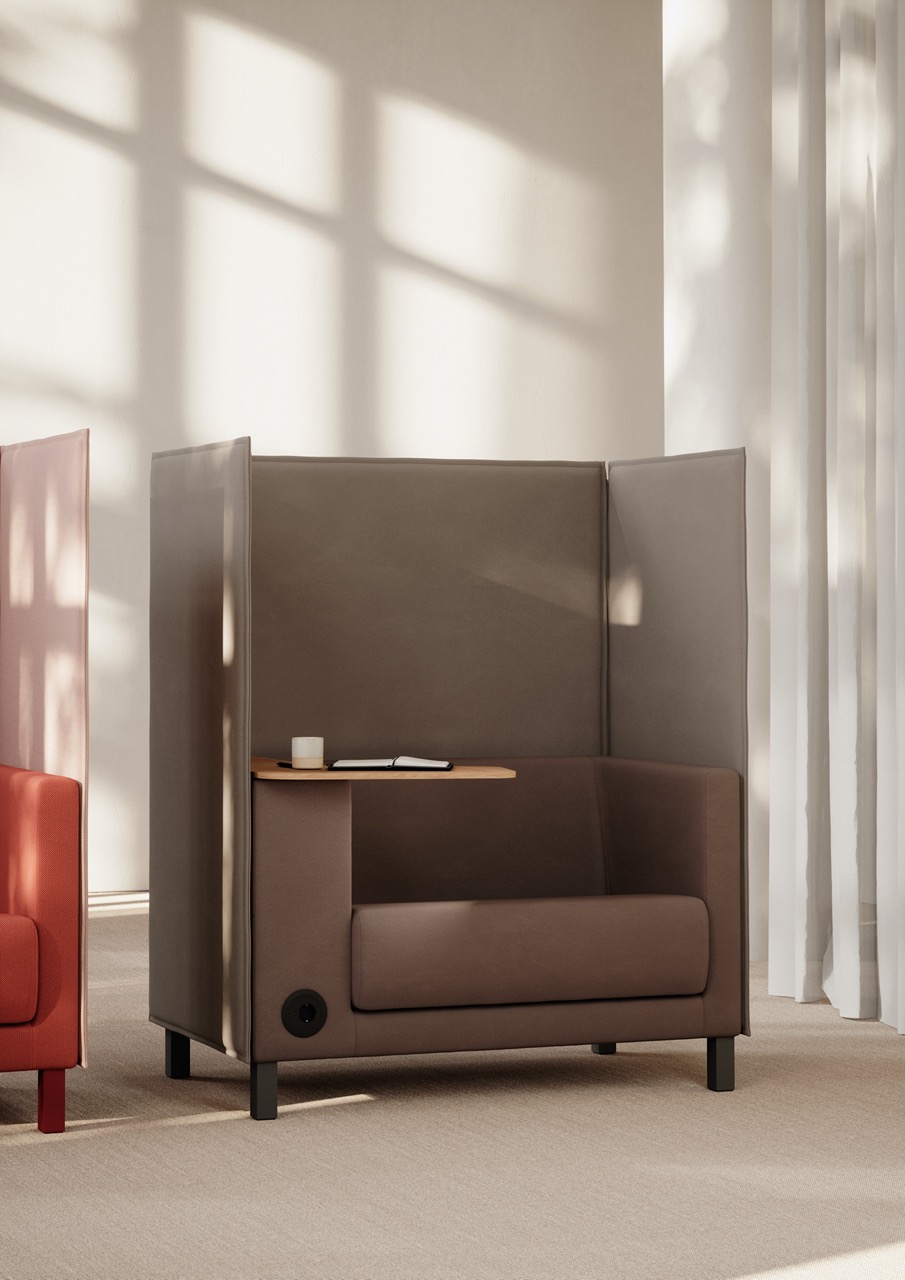 Concepută pentru micro-spații confortabile, colecția oferă atât versiuni joase, cât și variante cu pereți înalți, tapițați, care permit delimitarea unor zone intime dedicate întâlnirilor cu clienții, muncii în echipă sau discuțiilor informale.