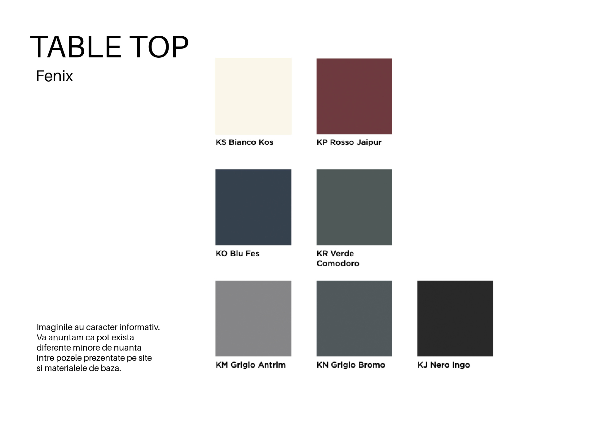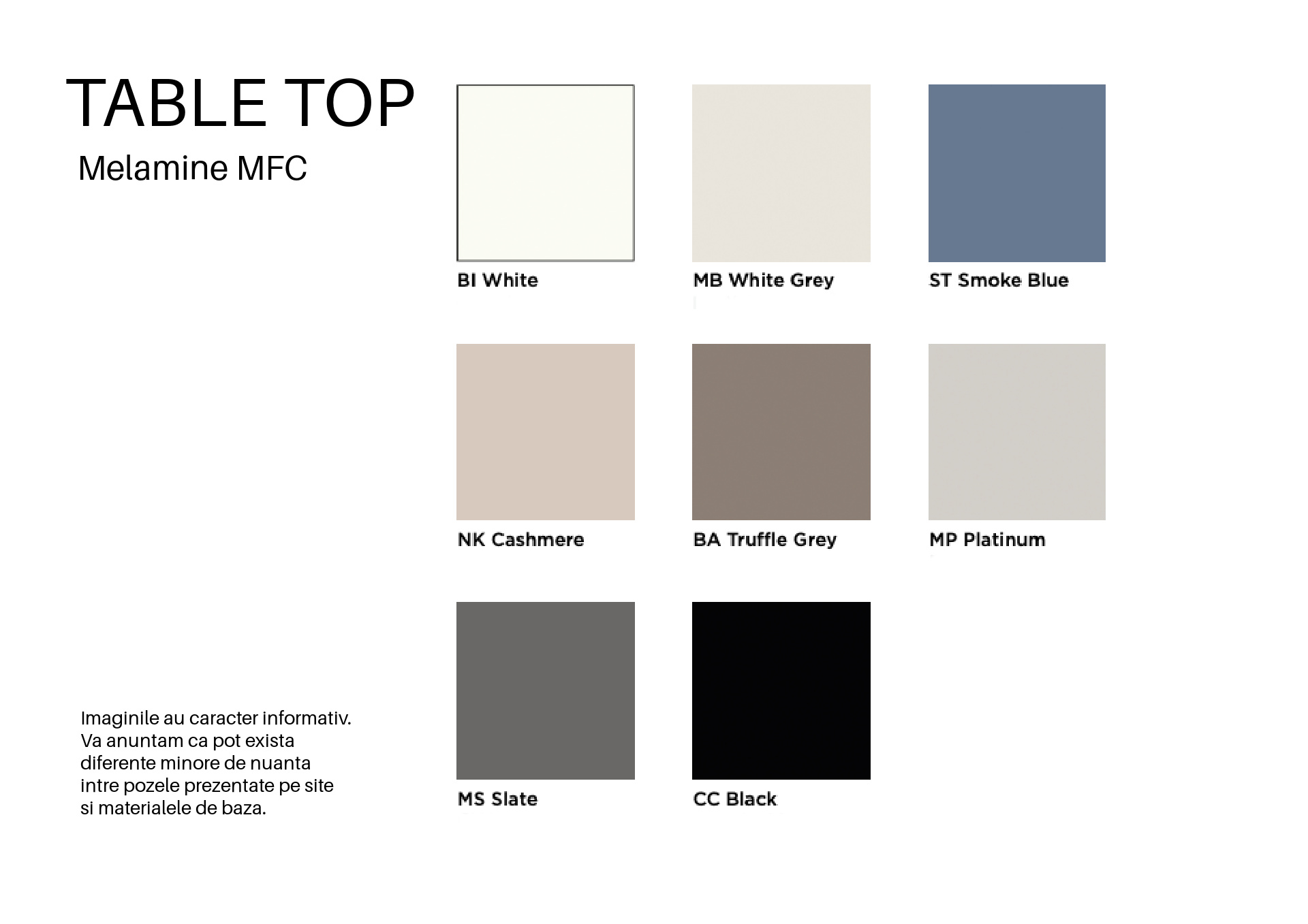 Blatul este disponibil în finisaje variate — metal, melamină sau Fenix — iar înălțimea este reglabilă: 560÷750mm, adaptându-se perfect la scaune de întâlnire sau fotolii lounge.