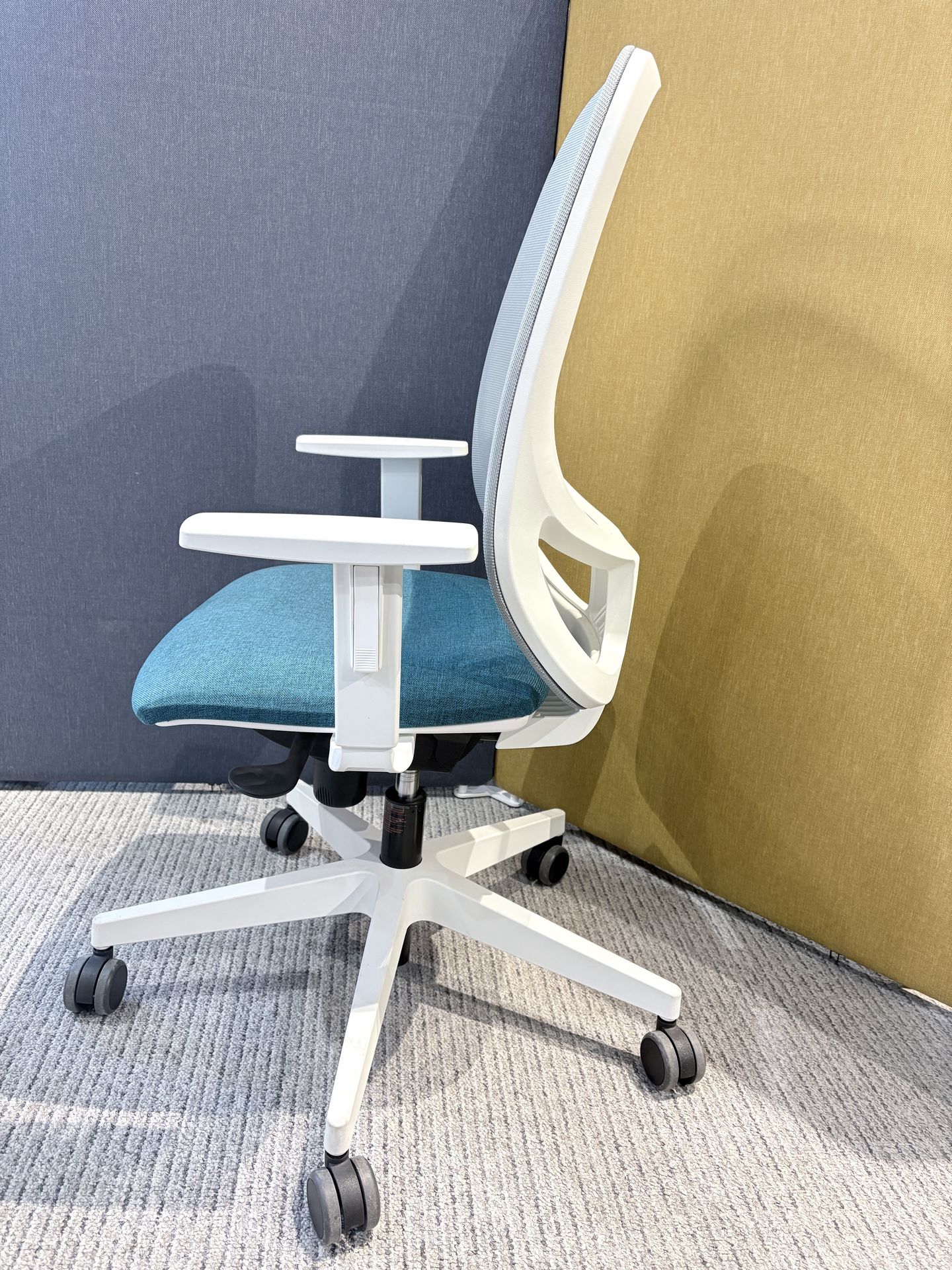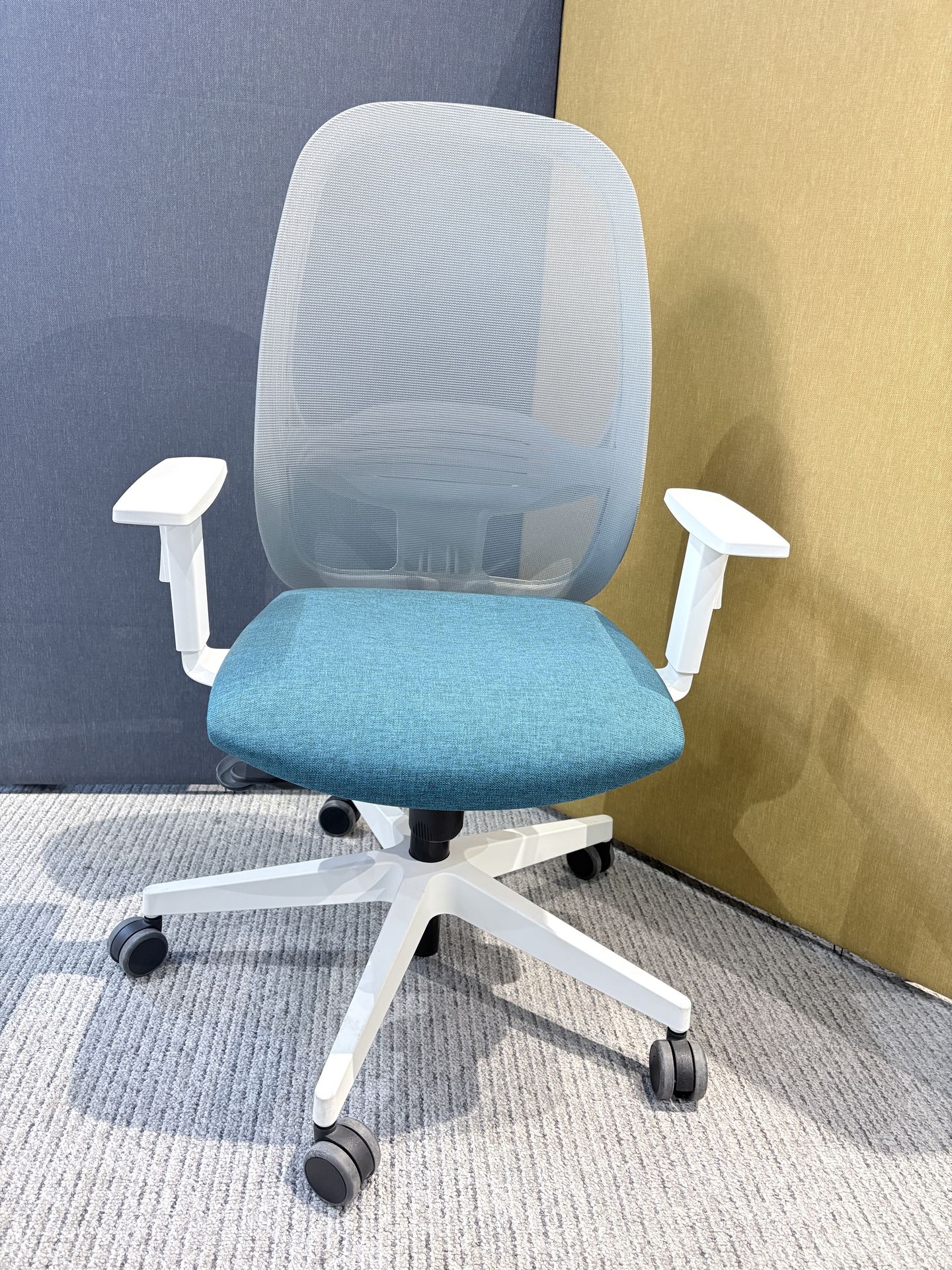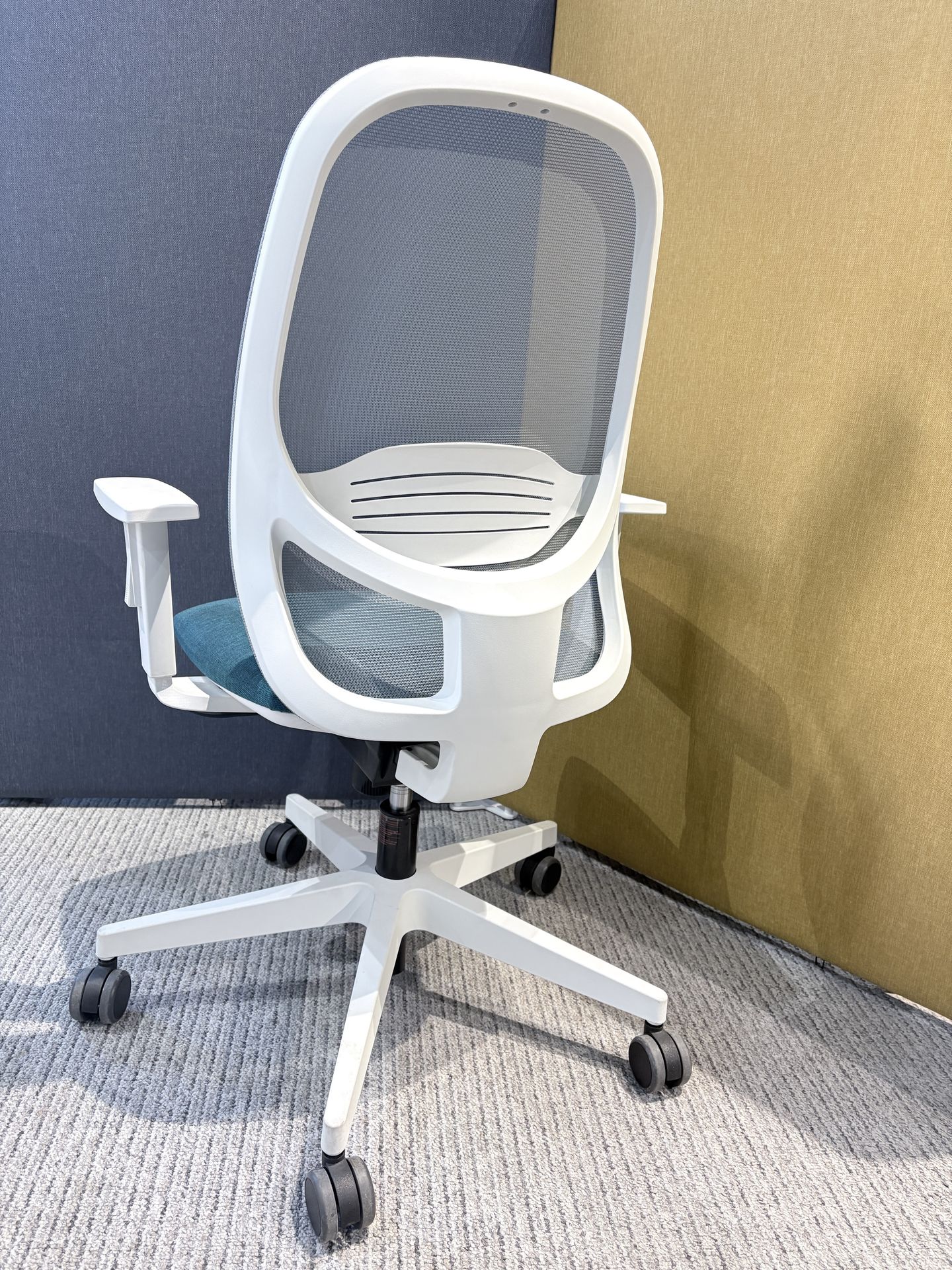 Baza scaunului este în formă de stea, realizată din plastic alb, dotată cu roți antialunecare pentru o mobilitate ușoară și stabilitate. Bratele scaunului sunt reglabile pe înălțime și sunt fabricate din plastic alb, completând astfel designul modern și funcțional al scaunului.