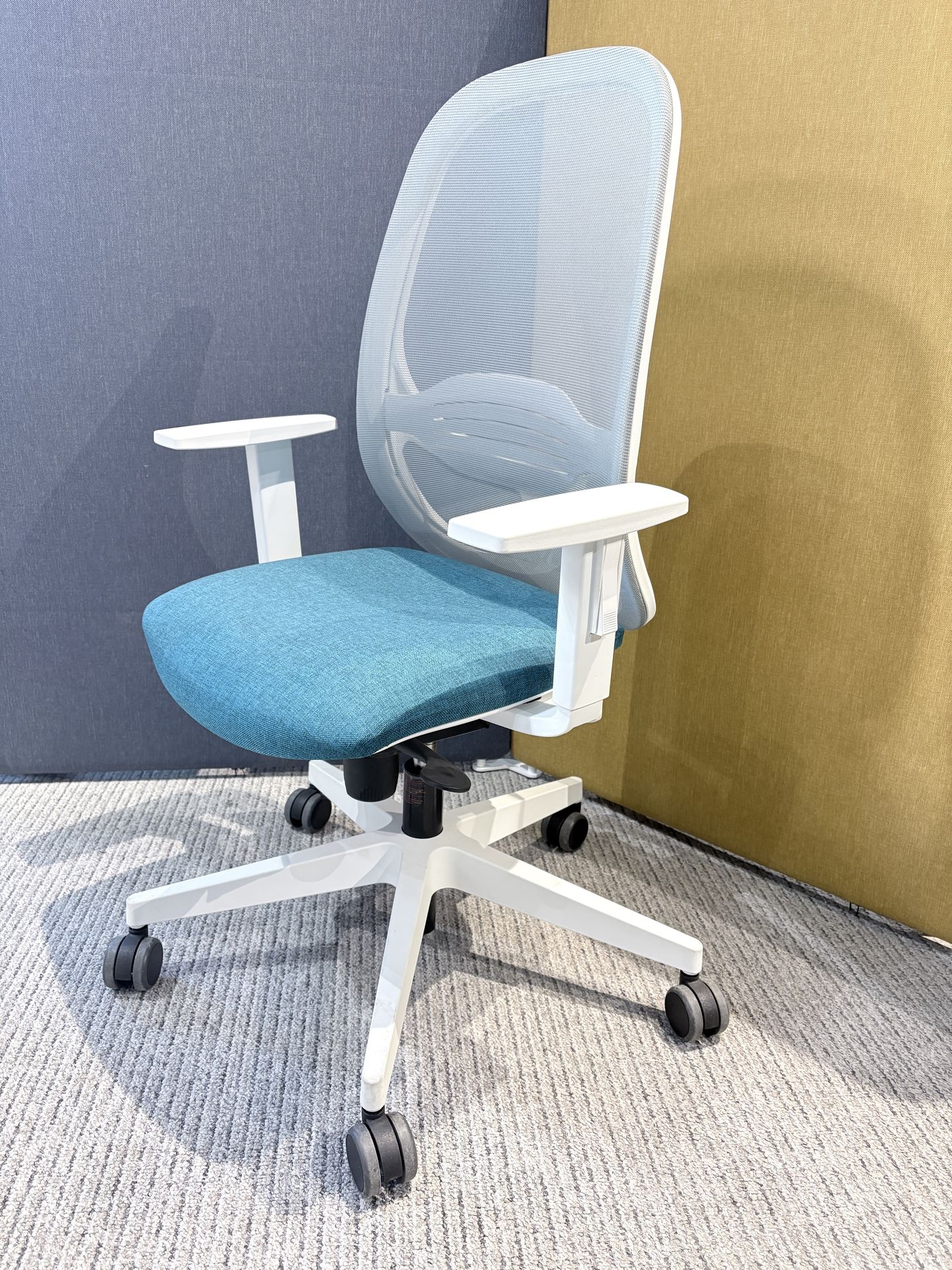 Sezutul scaunului este tapitat cu stofă disponibilă într-o varietate mare de culori, iar spătarul este acoperit cu mesh pentru o circulație optimă a aerului.