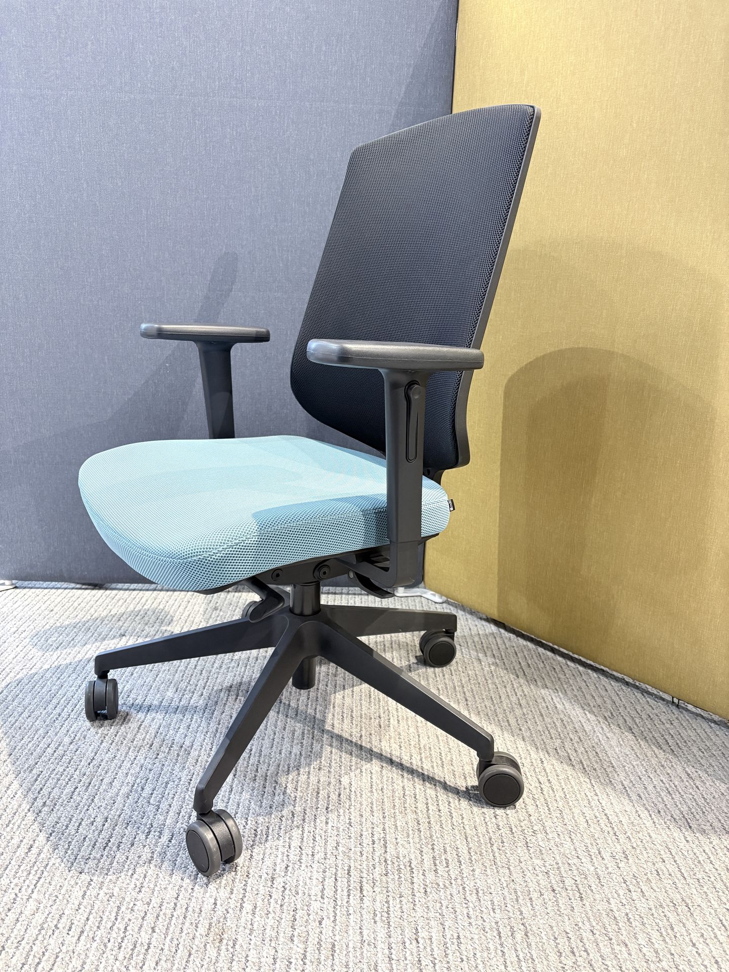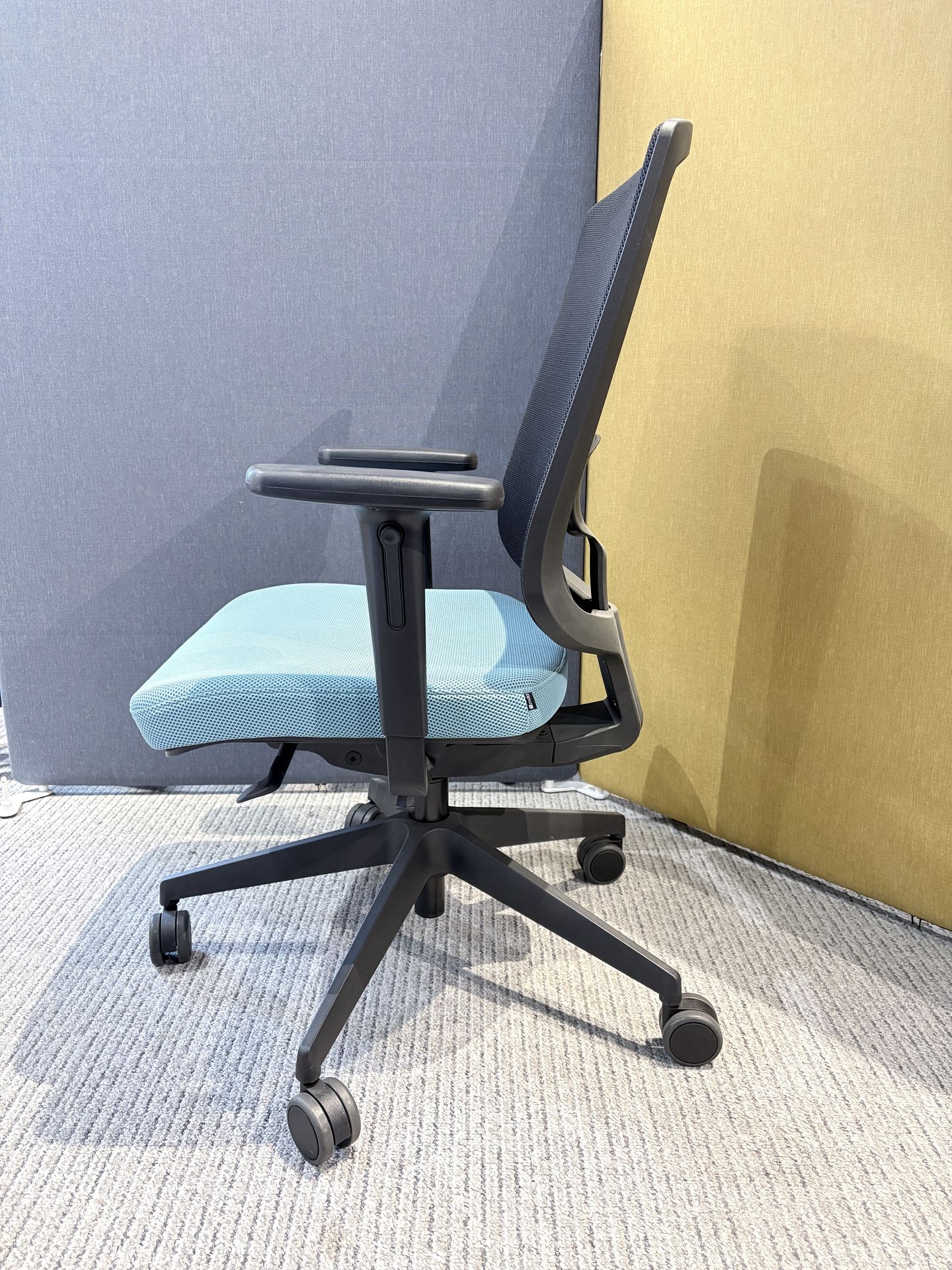 Baza scaunului este în formă de stea, realizată din plastic negru, dotată cu roți antialunecare pentru o mobilitate ușoară și stabilitate. Bratele scaunului sunt reglabile pe înălțime și sunt fabricate din plastic negru, completând astfel designul modern și funcțional al scaunului.