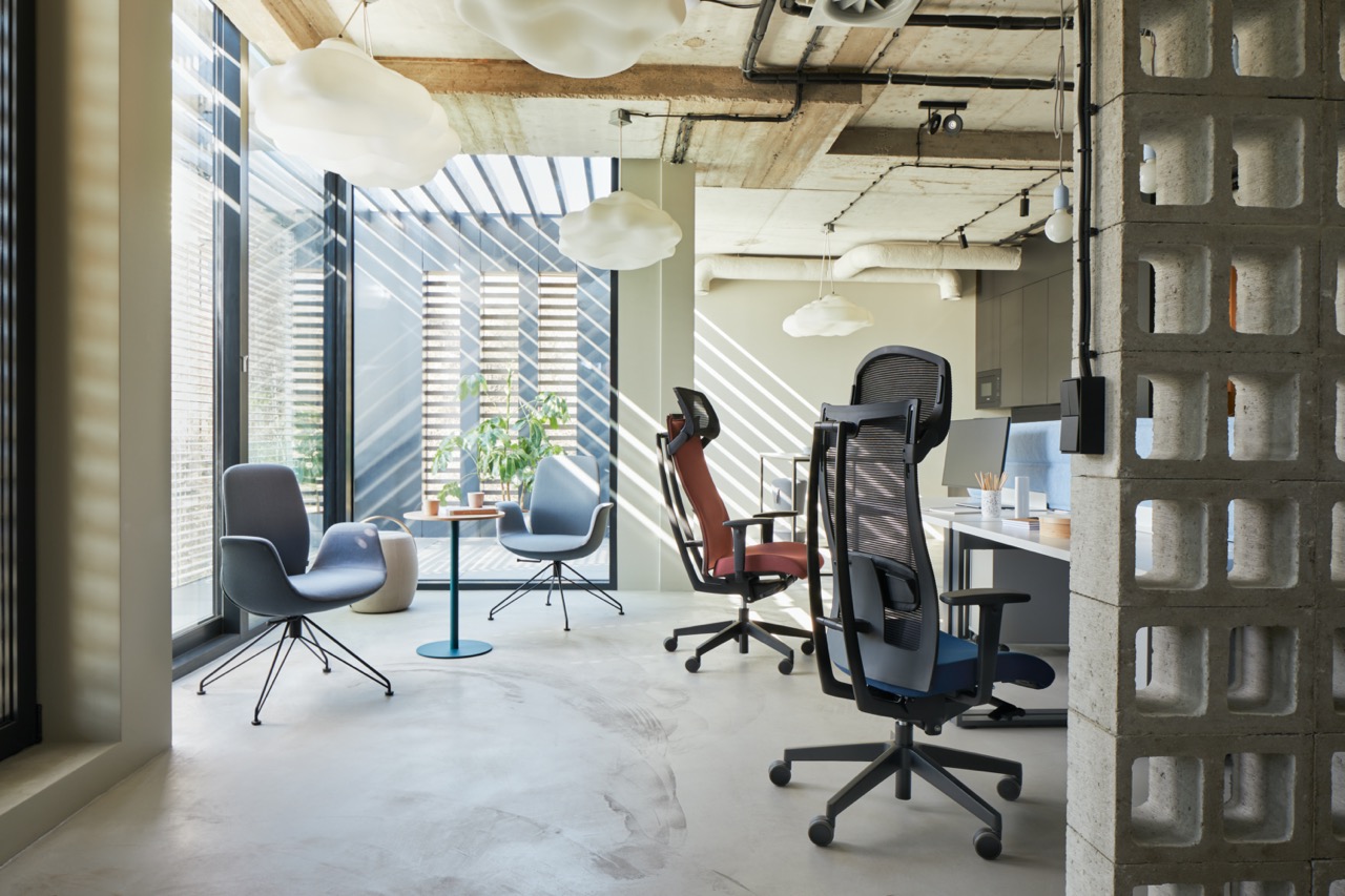 Forma scaunului este evidențiată de utilizarea elementelor din aluminiu, care îi conferă un caracter ușor industrial, modern și elegant.