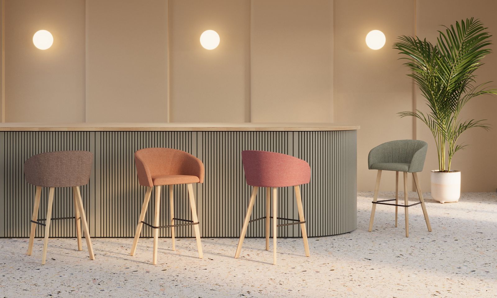 Forma sa curbată, cu spătar continuu și linii fluide, oferă o susținere naturală și o experiență confortabilă. Tapițeria atent finisată și structura metalică subțire, dar rezistentă, creează un echilibru perfect între estetică și funcționalitate.
