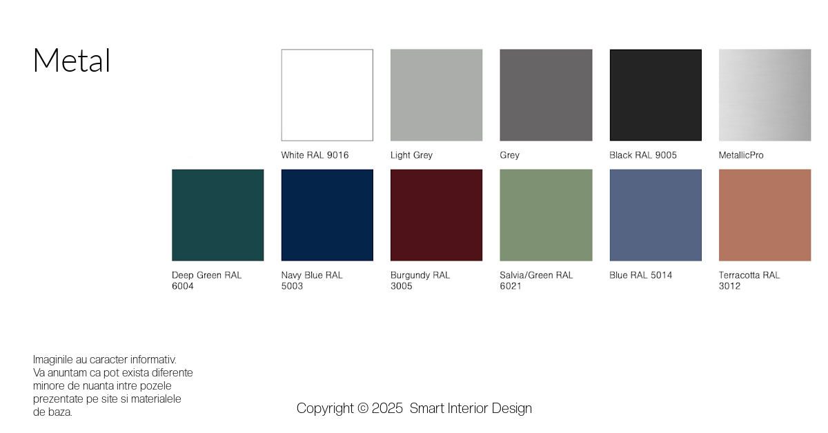 Structura metalică este disponibilă într-o gamă variată de finisaje, permițând personalizarea scaunului în funcție de stilul spațiului.
